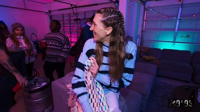 У блондинки отличное настроение, ведь она пришла на хату к друзьям, устроившим шумную вечеринку. Повсюду все пили алкоголь, участвуя в конкурсах, чем пользовалась сучка, флиртуя этим временем с парнем. Она показывала ему голую попку и намекала, что можно поразвлечься, пока остальные увлечены своими играми. Пока друзья не видят, девка сосет пенис парня и раком трахается с ним в киску, не боясь быть увиденной.